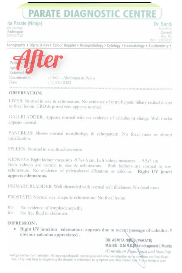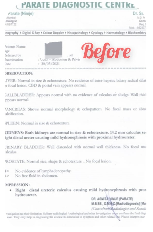 We are elated to share a remarkable success story in which a daunting medical challenge was overcome through our homeopathic treatment. A patient, grappling with a sizable 14 mm renal stone, sought our alternative therapeutic approach to address this pressing concern. Through a tailored homeopathic treatment plan, we are thrilled to announce that the formidable renal stone has been successfully removed. This success underscores the efficacy of homeopathy in offering non-invasive solutions to complex medical conditions, providing relief and restoring optimal health. We celebrate this achievement as a testament to the power of personalized, holistic care in overcoming challenging health issues.